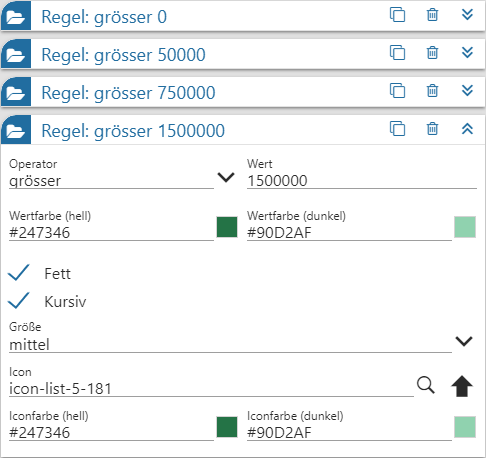 Mit Hilfe der folgenden Einstellungen können x unterschiedliche Formatierungen hinterlegt werden. Hierbei ist jede Formatierung automatisch mit einer Regel verbunden, d.h. kommt nur dann zum Tragen, wenn die Regel zutrifft.