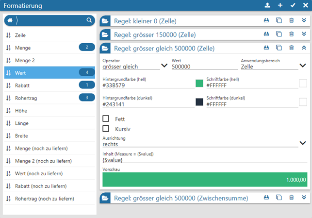 Um hier nicht den Überblick zu verlieren und direkt auf "wichtige" Informationen aufmerksam gemacht zu werden, steht im Olap die Formatierung zur Verfügung. Diese ermöglicht es, Zahlen nach bestimmten Regeln gesondert darzustellen.