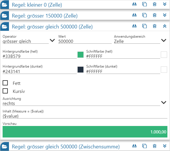 Mit Hilfe der folgenden Einstellungen können pro Measure x unterschiedliche Formatierungen hinterlegt werden. Hierbei ist jede Formatierung automatisch mit einer Regel verbunden, d.h. kommt nur dann zum Tragen, wenn die Regel zutrifft.