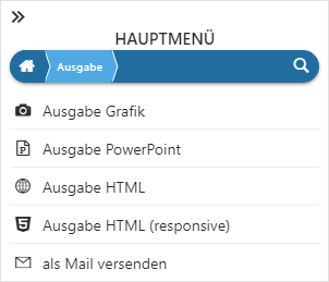 Durch Anwahl des Eintrags "Ausgabe" im Hauptmenü wird die Ausgabe-Auswahl geöffnet.