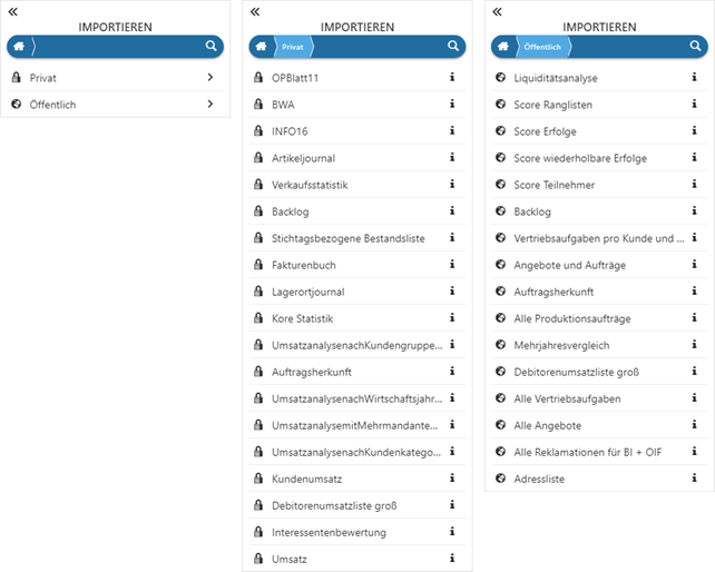 An dieser Stelle muss gewählt werden, ob eine private oder eine öffentliche Datenquelle importiert werden soll, wobei eine optische Unterscheidung immer gegeben ist: