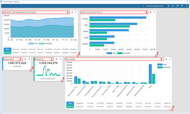 Alle Informationen innerhalb des Power Reports werden in Form von Widgets angezeigt. Hierbei handelt es sich um für sich stehende Elemente, in denen das aufbereitete Datenmaterial dargestellt wird. Neben dem Inhalt des Widgets kann auch die Größe und Position individuell vergeben werden.