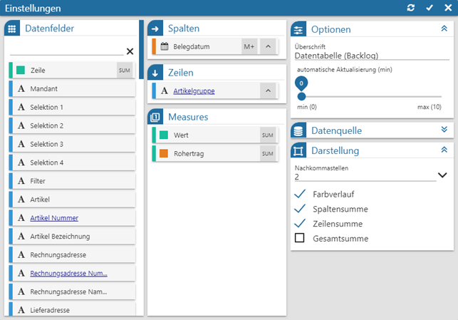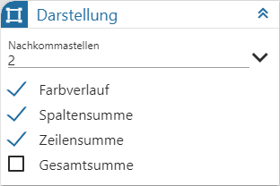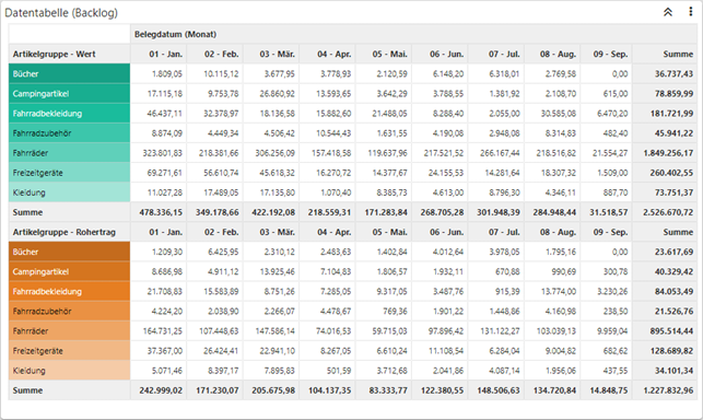 Das Datenmaterial wird in Form einer Kreuztabelle ausgegeben, wobei der Inhalt der Spalten und Zeilen, sowie die Sortierung, individuell gestaltet werden kann.