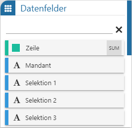 In dieser Tabelle werden alle Felder der Datenquelle dargestellt, welche per Drag & Drop in die Tabellen "X-Achse", "Datenreihen" und "Measures" übergeben werden können. Der Power Report unterscheidet hierbei nach den folgenden Datentypen: