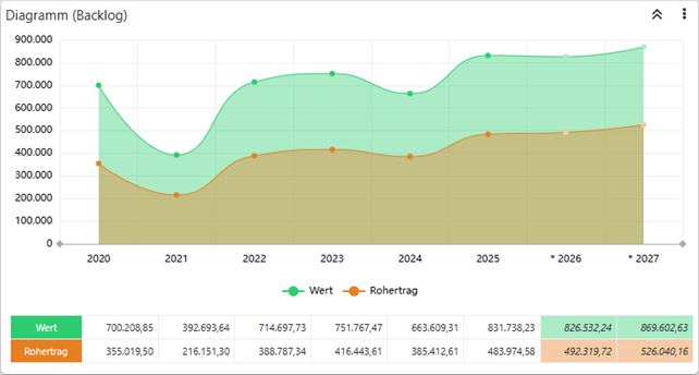 Sobald sich ein Datenfeld des Typs "Datum" (Darstellungsformat "Jahr") in der X-Achse befindet und die Datenreihe leer ist, steht der Bereich "Prognose" zur Verfügung. Über diesen können anhand der Vorjahresdaten Jahresprognosen abgegeben werden.