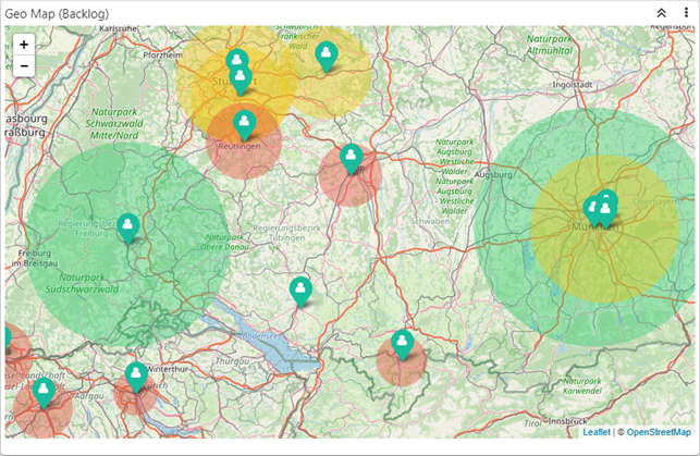 Das Datenmaterial wird in Form einer Geo Map dargestellt. Grundvoraussetzung hierfür ist eine aktive Internetverbindung, da das Kartenmaterial zur Laufzeit geladen wird.