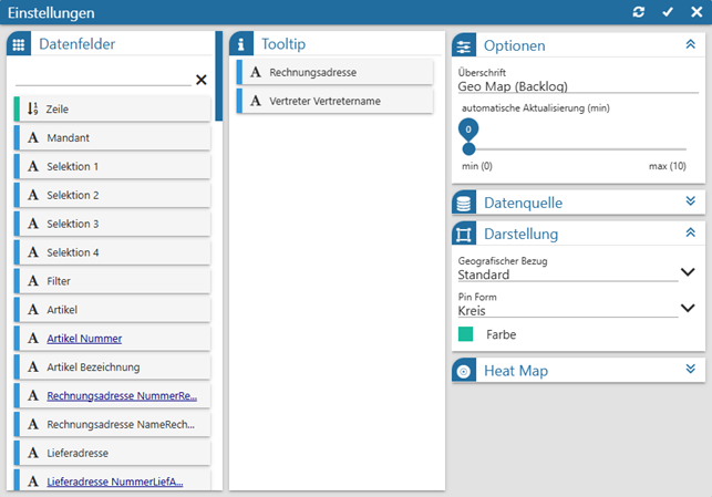 An dieser Stelle kann definiert werden, welche geografischen Koordinaten zur Darstellung der Pins verwendet werden sollen. Hierbei werden alle Datenfelder von Personenkonten, Interessenten und Vertretern angeboten. Die Auswahl "Standard" steht wiederum nur zur Verfügung, wenn die BI-Ausgabe selbst automatisch Koordinaten in den Snapshot ablegt.