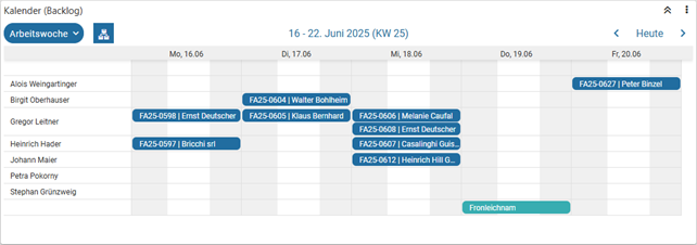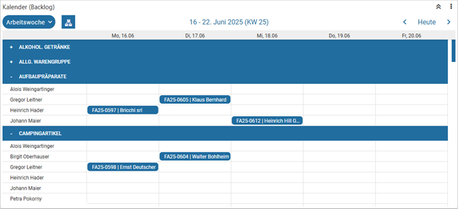 In dem Kalender wird nach "Artikelgruppe" und "Vertreter" gruppiert. Die Hauptgruppierung "Artikelgruppe" kann pro Gruppe auf- und zugeklappt werden.