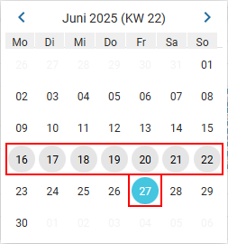 In der Mitte des Kalenders wird der aktuell dargestellte Zeitraum ausgegeben. Durch Anwahl dieser Information wird ein Minikalender zur schnellen Navigation geöffnet. Der aktuelle Tag wird in hellblau und die aktuelle Woche in grau dargestellt.