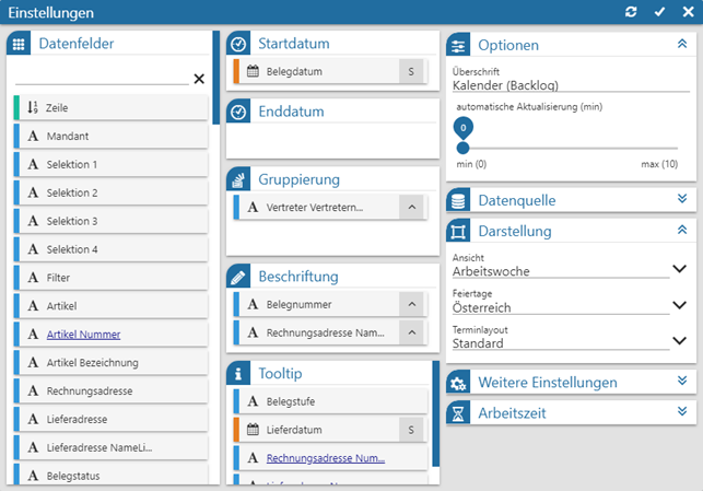 Mit Hilfe des Widgets "Kalender" wird das Datenmaterial in Form eines Kalenders dargestellt, wobei zumindest ein Feld des Typs "Datum" in der Datenquelle vorhanden sein muss. Folgende Spezialfunktionen stehen in diesem Widget zur Verfügung: