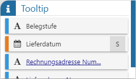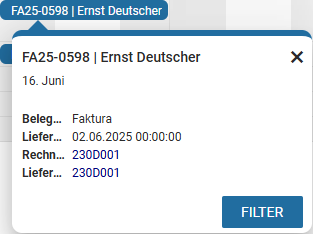 Zur besseren Orientierung werden die Informationen "Belegstufe", "Lieferdatum", "Rechnungsadresse Nummer" und "Lieferadresse Nummer" im ToolTip angezeigt. Der Button "Filter" löst den Quickfilter aus (siehe auch Feld "Filterfeld").