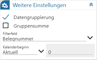 Bei einer Datengruppierung werden Zahlenfelder automatisch summiert. Des Weiteren steht diese Funktion bei "Live-Kalender-Widgets" nicht zur Verfügung.