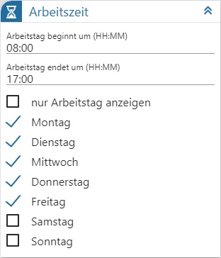 Im Bereich "Arbeitstage" kann definiert werden, welche Tage zur Arbeitswoche gehören. All jene Tage, die nicht zur hinzuzählen, werden im Kalender mit einer grauen Schraffierung unterlegt.