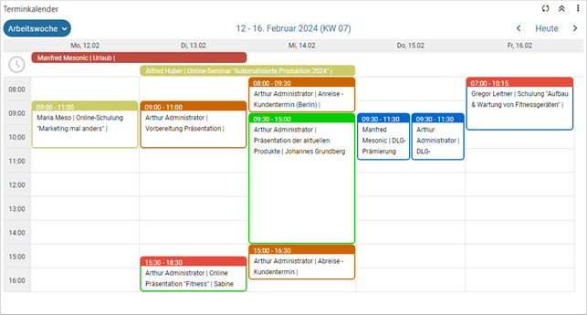 Der Arbeitstag beginnt um 08:00Uhr und endet um 17:00Uhr. Am 13.02.2024 findet ein Teil des Termins nach der Arbeitszeit statt, am 16.02.2024 davor.