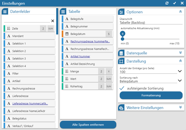 An dieser Stelle wird die Sortierung in der Tabelle definiert. Der Eintrag "Standard" steht hierbei für die Sortierung, welche das Ausgangsprogramm der Datenquellen mitgegeben hat.