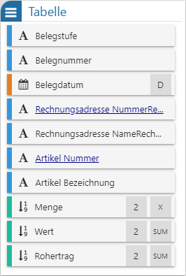 In dieser Tabelle werden alle Felder der Datenquelle dargestellt, welche per Drag & Drop in die Tabelle "Tabelle" übergeben werden können. Der Power Report unterscheidet hierbei nach den folgenden Datentypen: