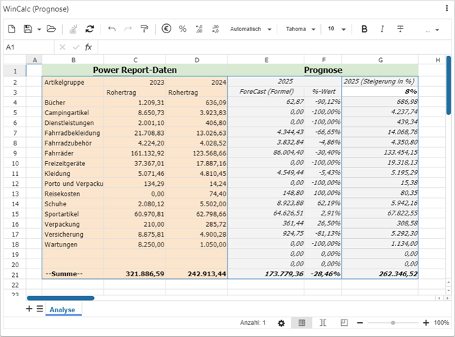 Die Besonderheit des WinCalc innerhalb des Power Reports liegt im Datenzugriff und der Interaktivität. Mit Hilfe der Funktion GETBIDATA kann auf fast alle Widgetdaten zugegriffen werden. Bei z.B. Nutzung eines Quickfilters erfolgt eine direkte Aktualisierung der Daten im CalcSheet.