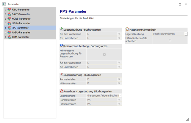 Über den Bereich "PPS-Parameter" können die Hauptparameter der WinLine PPS definiert werden, wobei die Einstellungen in 9 Bereiche unterteilt sind.