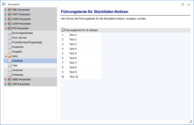 Über den Bereich "PPS-Parameter - Notiz - Stückliste" können die Texte der Stückliste parametrisiert werden.