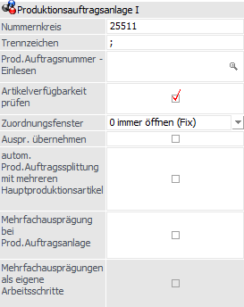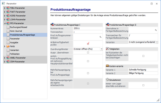 Über den Bereich "PPS-Parameter - Produktionsauftragsanlage" können die allgemeinen Einstellungen für die Anlage von Produktionsaufträgen vorgenommen werden.
