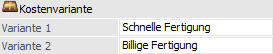 In diesem Feld kann die Bezeichnungen der zweiten Kostenvarianten einer Tätigkeit definiert werden. Standardmäßig ist die Bezeichnung "Billige Fertigung" hinterlegt.