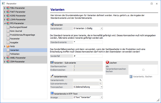 Über den Bereich "PPS-Parameter - Varianten" können die allgemeine Einstellungen für die Varianten der WinLine PPS vorgenommen werden.