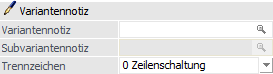 An dieser Stelle kann die Subvariantennotiz mit Hilfe von Variablen definiert werden. Neben den Variablen des Matchcodes (Artikelview und Stücklistenstamm - jeweils bezogen auf den aktuellen Produktionsartikel bzw. die aktuelle Stückliste) stehen folgende Variablen zusätzlich zur Verfügung: