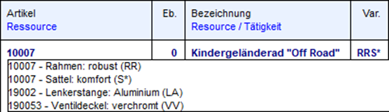 werden die Namen der gewählten Varianten in die Artikelnotiz eingefügt. Der Text
