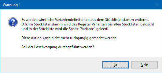 Wenn auf diesen Button geklickt wird, so erscheint nächst eine Warnmeldung mit der Frage, ob alle Variantendefinitionen aus dem Stücklistenstamm entfernt werden sollen.