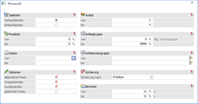 Damit "gelöschte Preise" ausgegeben werden können, muss im Variablen Audit die Option "Einf/Lösch" aktiviert worden sein.