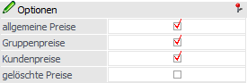 Über die Optionen kann gesteuert werden, welche Preistypen (allgemeine Preise, Gruppenpreise, Kundenpreise) angedruckt werden sollen. Zusätzlich kann die Ausgabe von bereits gelöschten Preisen aktiviert werden.