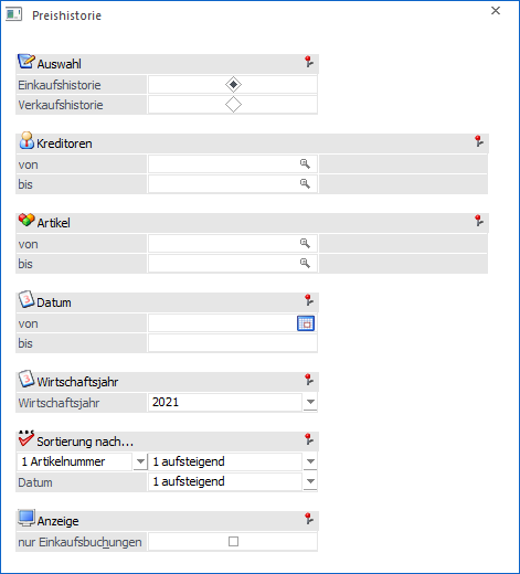 Je nachdem, welche Historien-Option gewählt wurde, können hier die Debitoren bzw. Kreditoren eingeschränkt werden, von denen die Preishistorie ausgewertet werden soll.