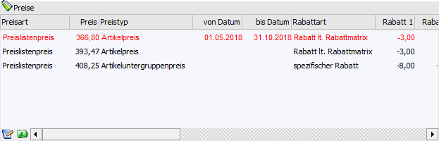 In der Tabelle "Preise" werden die Preise des Artikels, bezogen auf die Preisermittlungsbasis, angezeigt. Sollten keinerlei passenden Preise gefunden werden (siehe auch Button "alle Preise / nur gültige Preise" bzw. "erweiterte Preisanzeige"), so wird in der Tabelle der allgemeine VK-Preis bzw. EK-Preis vorgeschlagen.