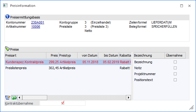 Wird diese Option aktiviert so kann im rechten Bereich durch Aktivieren der entsprechenden Checkboxen bestimmt werden, welche Werte aus dem Kontraktpreis zusätzlich zum gewählten Preis in die Belegmittelteilszeile (Artikelzeile) übernommen werden.