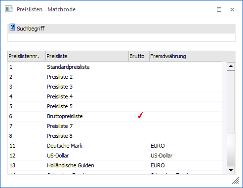 Die Auswahl kann durch die Eingabe eines Suchbegriffs eingeschränkt werden. Die Suche erfolgt in den Feldern "Preislistennummer" und "Bezeichnung".