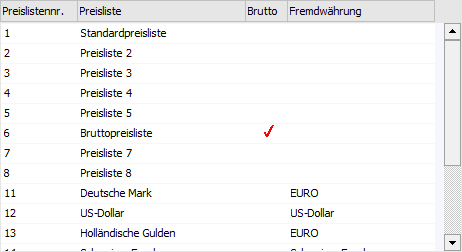 In der Tabelle werden nach Auslösen der Suche (Button "Anzeigen" oder Suchbegriff bestätigen) die gefundenen Preislisten mit ihrer Nummer und Bezeichnung angezeigt. Per Doppelklick oder Enter-Taste kann die ausgewählte Preisliste anschließend in das Ausgangsfenster übernommen werden.