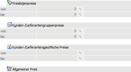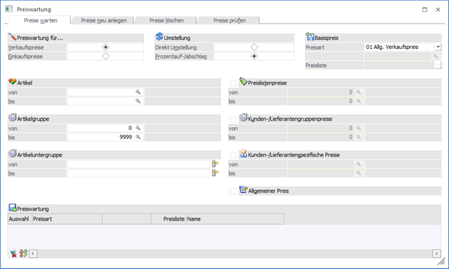 An dieser Stelle kann durch Aktivierung der einzelnen Bereiche definiert werden, welche Preisarten gewartet / angelegt / geprüft / gelöscht werden sollen. Neben einer grundsätzlichen Aktivierung muss im nachfolgenden "von / bis" jeweils eine Eingabe erfolgen.