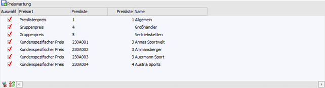Nach Drücken des Buttons "Anzeigen" wird die Tabelle "Preiswartung" gemäß der zuvor getroffenen Selektion bzw. den getroffenen Einstellungen mit den Zieleinträgen gefüllt.