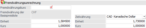 Wird als Basis- oder Zielpreis eine Preisliste mit Fremdwährung ausgewählt, so kann die Fremdwährungsumrechnung definiert werden.