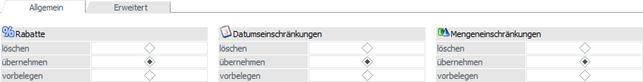Innerhalb des Fensters können die Preisdaten als solches definiert werden, d.h. um wieviel Prozent soll sich der Preis verändern oder von was auf was soll umgestellt werden. Zusätzlich können viele weitere Preisbestandteile (z.B. "Rabatt", "Datumseinschränkungen", "Mengeneinschränkungen" und "Colli") definiert werden.