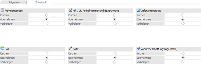 Mit Hilfe dieser Register können diverse weitere Preisbestandteile angepasst werden. Pro Objekt gibt es dabei in der Regel folgende Möglichkeiten, wobei die Objekte selber zwischen Einkauf und Verkauf zum Teil abweichend sind: