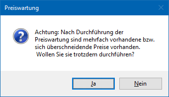 Wird diese Meldung mit "Ja" bestätigt, so sind anschließend Mehrfachpreise vorhanden. Dies kann dazu führen, dass z.B. in der Belegerfassung nicht der richtige Preis gefunden wird.