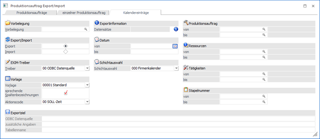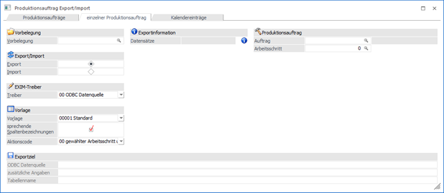 In diesem Register können Daten für einen selektierten Produktionsauftrag exportiert werden. Importiert können hingegen Daten für einen oder mehrere Produktionsaufträge.