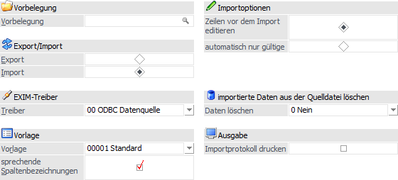 Mit Hilfe der Vorlage wird definiert, welche Felder importiert bzw. vorher exportiert werden sollen. Zusätzlich können Vorbelegungen hinterlegt werden.