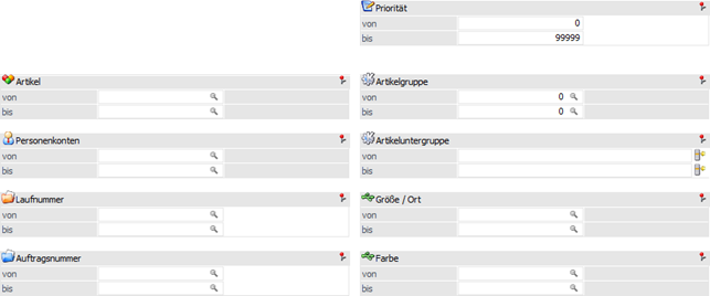 Eingabe des Bereichs von Auftragsnummern. Es werden nachfolgend nur die Produktionsaufträge vorgeschlagen, in welchen eine dieser Artikeluntergruppen zu finden ist.