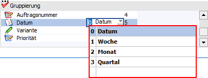 wiederum nach "Datum", "Woche", "Monat" oder "Quartal" gruppiert werden.