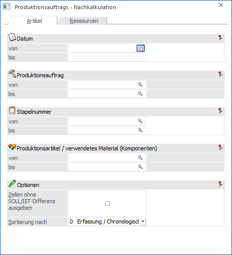 kann eine Differenzliste ausgegeben werden, welche die Differenz zwischen den Soll- und Istwerten berechnet und anzeigt. Die Liste kann wahlweise aufgrund der Artikel oder der Ressourcen ausgegeben werden.