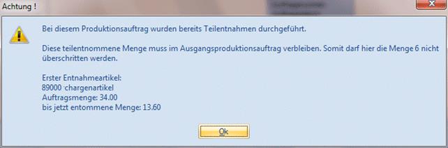 Es ist nun möglich Produktionsaufträge zu splitten, wofür Stücklistenteilen im Voraus schon teilentnommen wurden. Beim Splitten muss die verbleibende Menge vom Originalauftrag zumindest gleich groß bleiben wie die Menge wofür Teile schon entnommen wurden. Andernfalls erscheint beispielsweise die folgende Meldung: