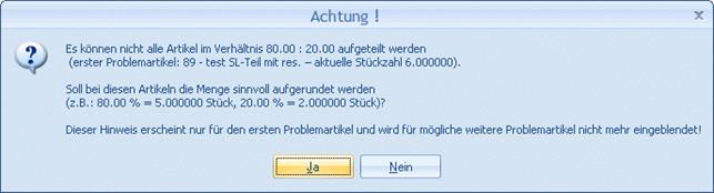 Wenn die Meldung mit JA bestätigt wird, werden die Produktionsmengen für alle Stücklistenteile mit hinterlegtem Ausschuss-Prozentsatz auf eine "runde" Zahl in den gesplitteten Produktionsaufträgen aufgerundet (d.h. eine Zahl, die die korrekte Anzahl von Nachkommastellen laut Artikelgruppe hat). Wenn NEIN gewählt wird, wird das Splittvorgang abgebrochen (ohne das Fenster zu schließen).