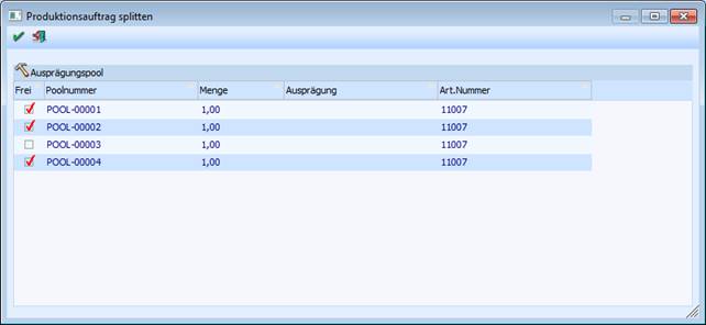 Wenn bei dem Produktionsartikel mit dem Ausprägungspool gearbeitet wird, dann kann während des Splittens in einem extra Fenster entschieden werden, welche Poolnummern dem neuen Produktionsauftrag zugeordnet werden sollen.